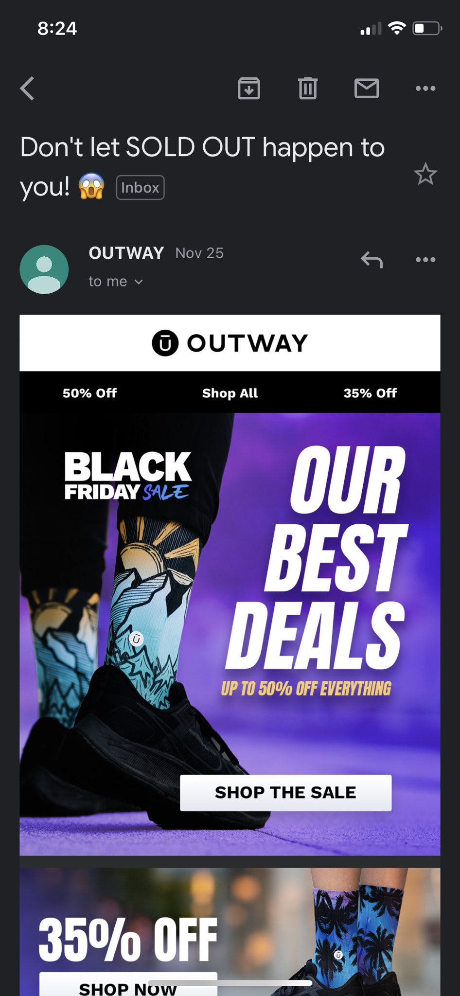 “I just like this one from Outway. It’s the colors, it’s the clear CTA, and it’s the little bit of FOMO in that subject line. Let’s be honest, it’s an incredible deal on a pricey sock,” said Geisler.